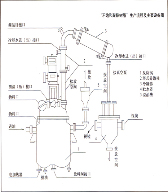 本全套裝置是用于生產不飽和聚脂樹脂、酚醛樹脂、環氧樹脂、ABS樹脂、油漆的關鍵設備。全套設備由反應鍋、豎式分餾柱、臥式冷凝器、貯水器、溢油槽、管線(對稀釜)等組成,全套設備與物料接觸部分的采用不銹鋼制作。